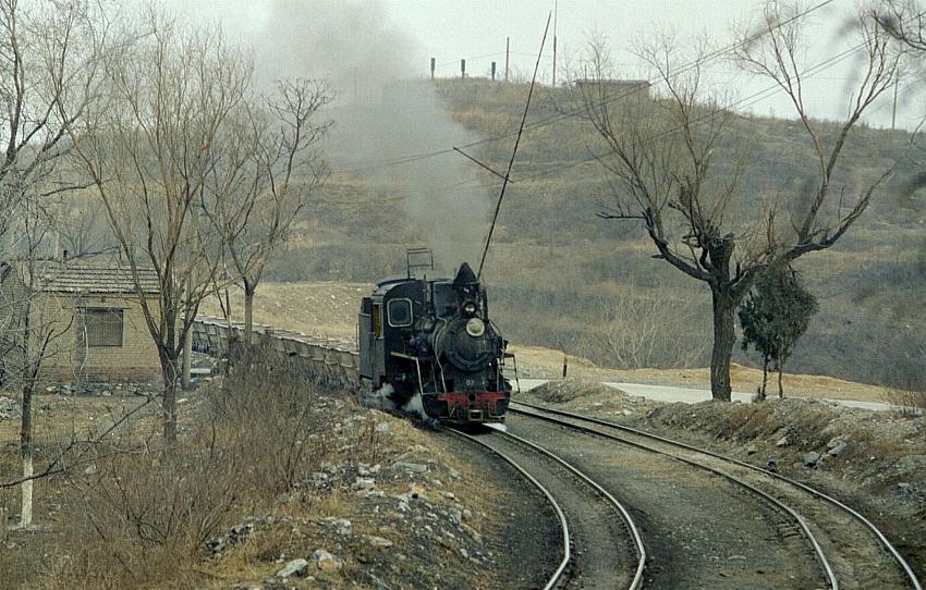 We stayed at the Post Hotel in Reshui, Inner Mongolia Autonomous Region with the loops of the Ji Tong Railway outside our window. We could hear the QJ class 2-10-2s going up and down the mountain all night long. An early start the next morning began the seemingly endless parade of steam trains on the Jing Peng pass line. Most freights were doubleheaded; only a handful were single engine trains.