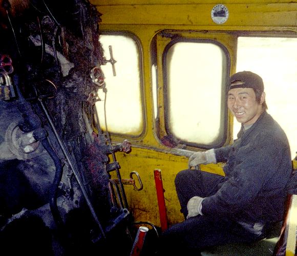 Saturday morning was the time Stan and I waited for. We headed for Linxi, east of Reshui. We wanted a long ride up to the Pass and we made it just in time to grab a 32 car doubleheaded westbound freight behind #7007. The crew was very friendly and we settled down inside, me sharing the fireman's seat with Meng Qing Long, the man I called the Little Fireman and Stan riding the jump seat directly behind. On these engines, the engineer is on the left and the fireman is on the right, just the opposite of US practice. Our engineer was Xia Qing He and the man I call the Big Fireman was Yuan Yong Sheng.